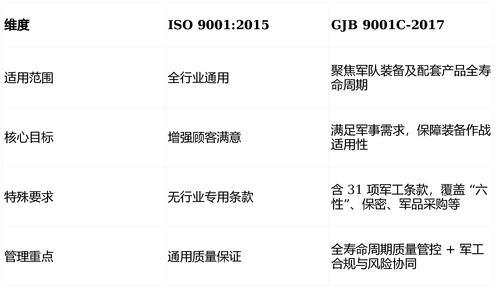 :正在 ISO 9001 “顾客对劲” 根本上,凸起 “军品必为精品”,满脚军事需求,确保配备正在全寿命周期内的靠得住性、维修性、保障性、测试性、平安性、顺应性(六性),适配做疆场景。